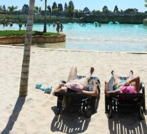Praia Artificial: Piscina com 14 tipos de ondas, areia branca, coqueiros e o som relaxante do mar.